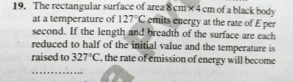 The rectangular surface of area 8 cm × 4 cm of a black body at a temperature of 127 0 C emits energy at the rate of E per second. If the length and breadth of the surface are each reduced to half of the initial value and the temperature is raised 327 o C, the rate of emission of energy will become