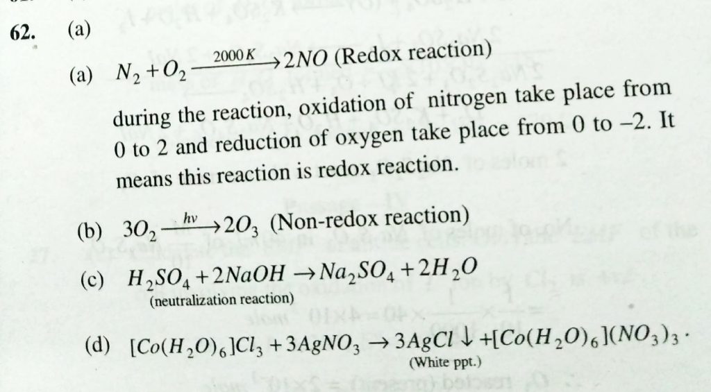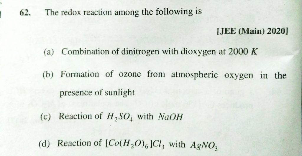 The redox reaction among the following is (a) combination of dinitrogen with dioxygen at 2000 k (b) Formation of ozone frm atomspheric oxygen in the presence of sunlight (c) Reaction of h2SO4 with NaOH (d) Reaction of [Co (H2O)6 ]Cl3 with AgNO3 For a reaction N2 (g) +3H2 (g) gives 2NH3(g) ;identify dihydrogen (H2) as a limitting reagent in the following reaction mixtures November 25, 2020 Category: Uncategorised (JEE Advanced Physics by BM Sharma + GMP Solutions) , Facebook Messenger WhatsApp Share this:TwitterFacebook Related