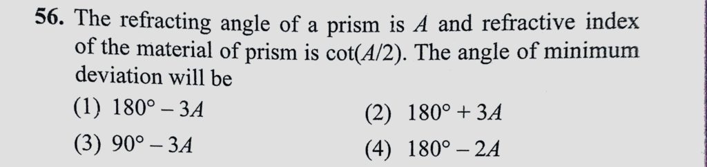 The refracting angle of a prism is A and refractive index of the material of prism is cot(A/2). The angle of minimum deviation will be The refracting angle of a prism is A and refractive index of the material of prism is cot(A/2). The angle of minimum deviation will be October 6, 2020 Category: Uncategorised (JEE Advanced Physics by BM Sharma + GMP Solutions) , Facebook Messenger WhatsApp Share this:TwitterFacebook Related
