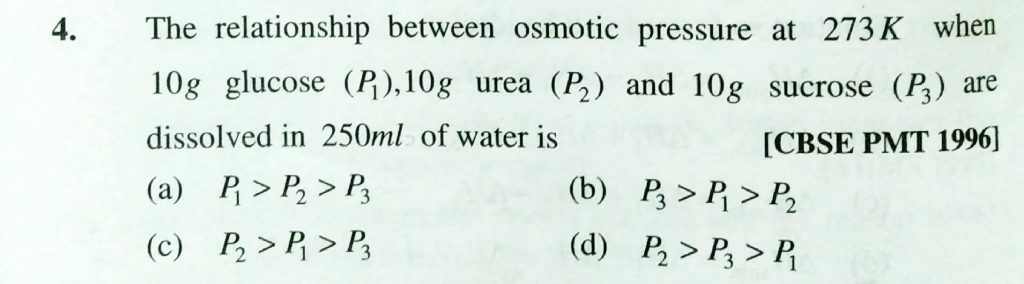 The relationship between osmotic pressure at 273 K when 10 g glucose ( P1 ) , 10 g urea ( P2) and 10 g sucrose ( P3 ) are dissolved in 250 ml of water is 10 g urea ( P2) and 10 g sucrose ( P3 ) are dissolved in 250 ml of water is The relationship between osmotic pressure at 273 K when 10 g glucose ( P1 ) December 13, 2020 Category: Uncategorised (JEE Advanced Physics by BM Sharma + GMP Solutions) , Facebook Messenger WhatsApp Share this:TwitterFacebook Related
