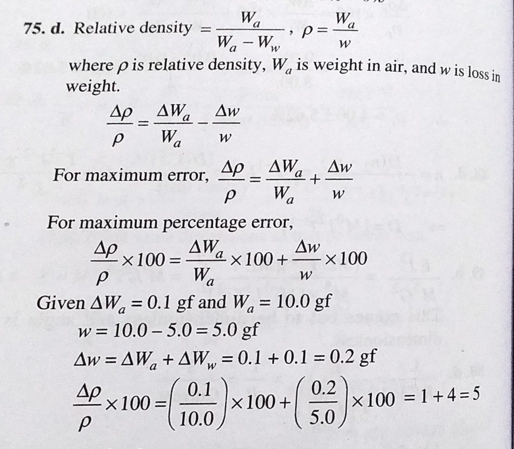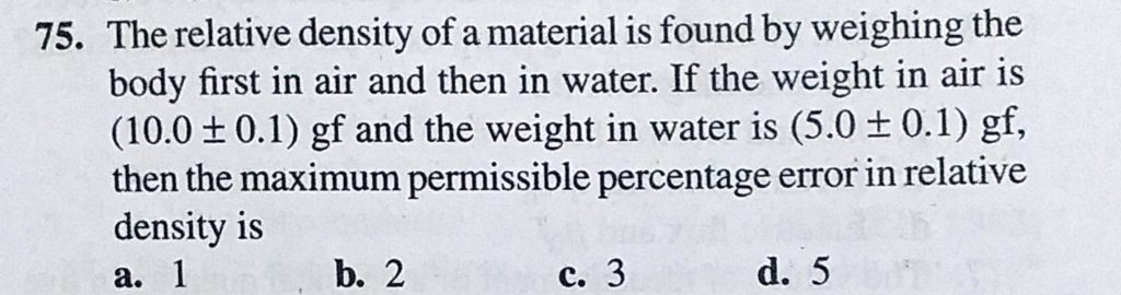 The relative density of a material is found by weighing the body first in air and then in water. If the weight in air is (10.0 +- 0.1) gf and the weight in water is (5.0 +- 0.1) gf, then the maximum The relative density of a material is found by weighing the body first in air and then in water. If the weight in air is (10.0 +- 0.1) gf and the weight in water is (5.0 +- 0.1) gf then the maximum September 15, 2020 Category: Uncategorised (JEE Advanced Physics by BM Sharma + GMP Solutions) , Facebook Messenger WhatsApp Share this:TwitterFacebook Related