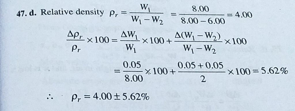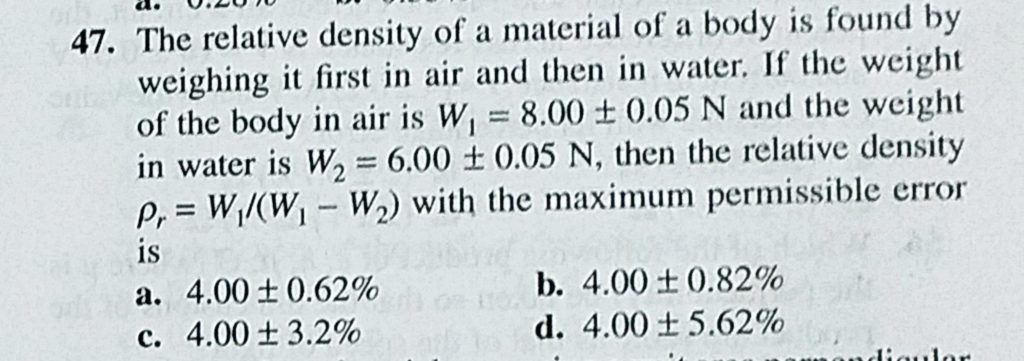 The relative density of a material of a body is found by weighing it first in air and then in water. If the weight of the body in air is W1 = 8.00 +- 0.05 N and the weight in water is W2 = 6.00 +- 0.05 N, then the relative density and t is the time. where E is the energy Write the dimensions of a * b in the relation E = b - x^2 /at x is the displacement September 15, 2020 Category: Uncategorised (JEE Advanced Physics by BM Sharma + GMP Solutions) , Facebook Messenger WhatsApp Share this:TwitterFacebook Related