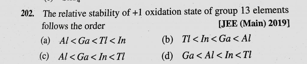 The relative stability of +1 oxidation state of group 13 elements follows the order (a) Al < Ga < Tl < In (b) Tl < In < Ga < Al The relative stability of +1 oxidation state of group 13 elements follows the order (a) Al < Ga < Tl < In (b) Tl < In < Ga < Al November 28, 2020 Category: Uncategorised (JEE Advanced Physics by BM Sharma + GMP Solutions) , Facebook Messenger WhatsApp Share this:TwitterFacebook Related