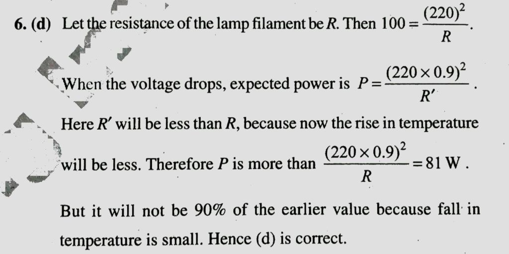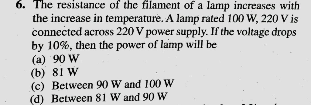 The resistance of the filament of a lamp increases with the increase in temperature. A lamp rated 100 W and 220 V is connected across 220 V power supply. If the voltage drops by 10 %, then the power of the lamp will be The resistance of the filament of a lamp increases with the increase in temperature. A lamp rated 100 W and 220 V is connected across 220 V power supply. If the voltage drops by 10 % then the power of the lamp will be September 21, 2020 Category: Uncategorised (JEE Advanced Physics by BM Sharma + GMP Solutions) , Facebook Messenger WhatsApp Share this:TwitterFacebook Related