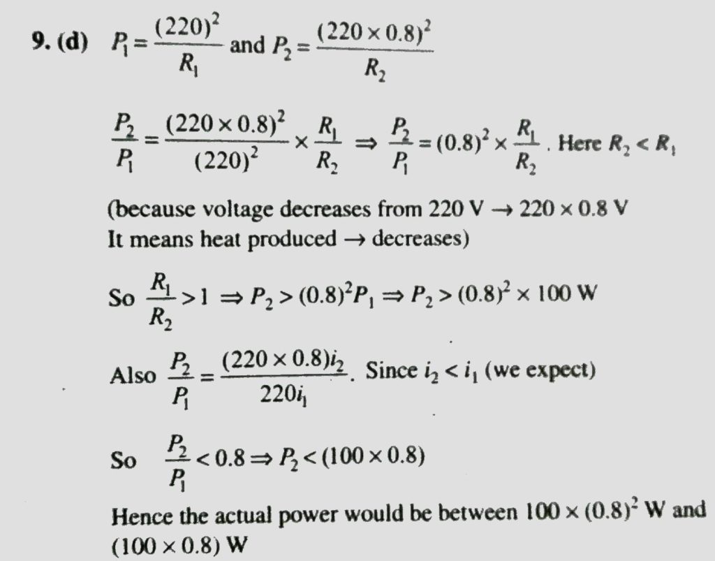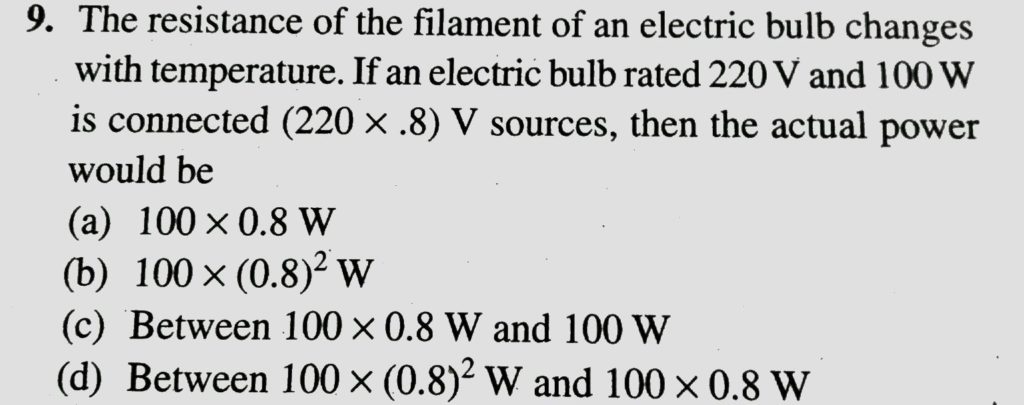 The resistance of the filament of an electric bulb changes with temperature. If an electric bulb rated 220 volt and 100 watt is connected ( 220× 8 ) volt sources, then the actual power would be The resistance of the filament of an electric bulb changes with temperature. If an electric bulb rated 220 volt and 100 watt is connected ( 220× 8 ) volt sources then the actual power would be September 21, 2020 Category: Uncategorised (JEE Advanced Physics by BM Sharma + GMP Solutions) , Facebook Messenger WhatsApp Share this:TwitterFacebook Related