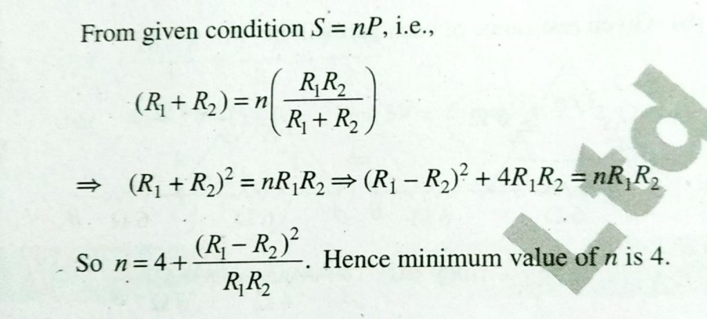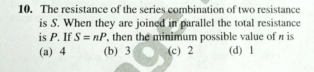 The resistance of the series combination of two resistance is S. when they are joined in parallel the total resistance is P. If S = nP, then the minimum possible value of n is The resistance of the series combination of two resistance is S. when they are joined in parallel the total resistance is P. If S = nP then the minimum possible value of n is September 19, 2020 Category: Uncategorised (JEE Advanced Physics by BM Sharma + GMP Solutions) , Facebook Messenger WhatsApp Share this:TwitterFacebook Related