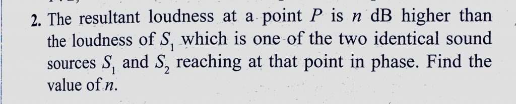 The resultant loudness at a point P is n dB higher than the loudness of S1 which is one of the two identical sound sources S1 and S2 reaching at that point in phase. Find the value The resultant loudness at a point P is n dB higher than the loudness of S1 which is one of the two identical sound sources S1 and S2 reaching at that point in phase. Find the value November 8, 2020 Category: Uncategorised (JEE Advanced Physics by BM Sharma + GMP Solutions) , Facebook Messenger WhatsApp Share this:TwitterFacebook Related