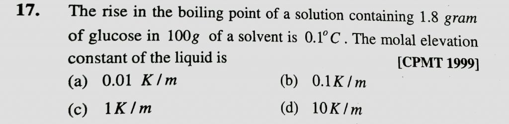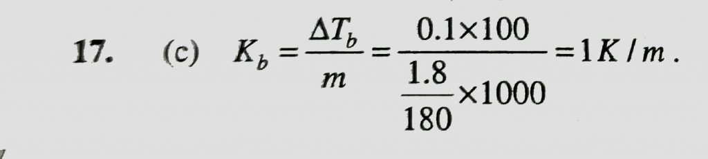 The rise in boiling point of a solution containing 1.8 g glucose in 100 g of a solvent is 0.1∘C. The molal elevation constant of the liquid is- The rise in boiling point of a solution containing 1.8 g glucose in 100 g of a solvent is 0.1∘C. The molal elevation constant of the liquid is- December 13, 2020 Category: Uncategorised (JEE Advanced Physics by BM Sharma + GMP Solutions) , Facebook Messenger WhatsApp Share this:TwitterFacebook Related