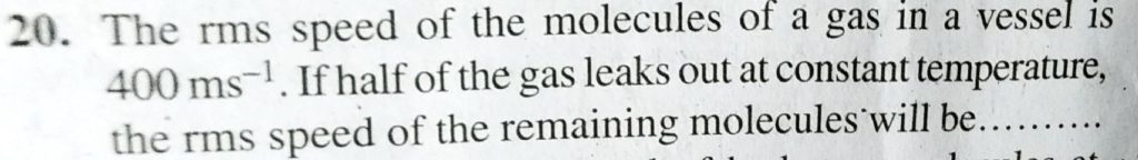 The rms speed of a molecules of a gas in a vessel is 400 m/s. If half of the gas leaks out at constanmt temperature, the rms speed of the remaining molecules will be……….. The rms speed of a molecules of a gas in a vessel is 400 m/s. If half of the gas leaks out at constanmt temperature the rms speed of the remaining molecules will be........... October 4, 2020 Category: Uncategorised (JEE Advanced Physics by BM Sharma + GMP Solutions) , Facebook Messenger WhatsApp Share this:TwitterFacebook Related