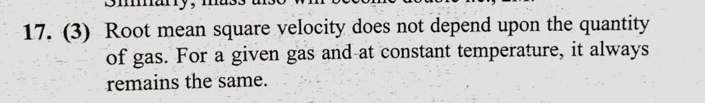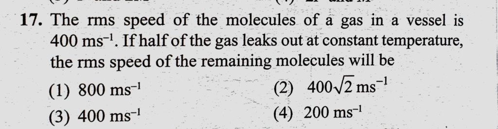 The rms speed of the molecules of a gas in a vessel is 400 m/s. If half of the gas leaks out at constant temperature, the rms speed of the remaining molecules will be The rms speed of the molecules of a gas in a vessel is 400 m/s. If half of the gas leaks out at constant temperature the rms speed of the remaining molecules will be........... October 27, 2020 Category: Uncategorised (JEE Advanced Physics by BM Sharma + GMP Solutions) , Facebook Messenger WhatsApp Share this:TwitterFacebook Related