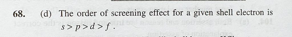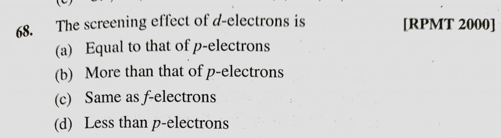 The screening effect of d-electrons is (a) Equal to that of p-electrons (b) More than that of p-electrons (c) Same as f-electrons (d) Less than p-electrons The screening effect of d-electrons is (a) Equal to that of p-electrons (b) More than that of p-electrons (c) Same as f-electrons (d) Less than p-electrons November 8, 2020 Category: Uncategorised (JEE Advanced Physics by BM Sharma + GMP Solutions) , Facebook Messenger WhatsApp Share this:TwitterFacebook Related