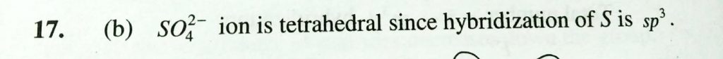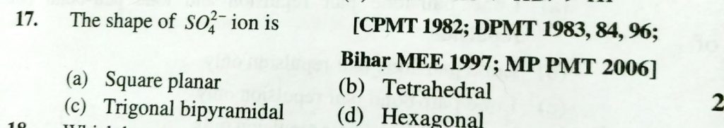 The shape of SO4^2- ion is (a) square planar (b) Tetrahedral (c) trigonal bipyramidal (d) Hexagonal The shape of SO4^2- ion is (a) square planar (b) Tetrahedral (c) trigonal bipyramidal (d) Hexagonal December 7, 2020 Category: Uncategorised (JEE Advanced Physics by BM Sharma + GMP Solutions) , Facebook Messenger WhatsApp Share this:TwitterFacebook Related