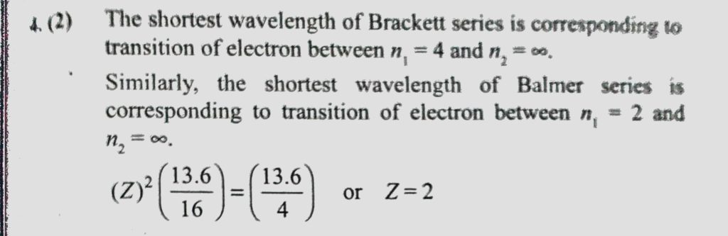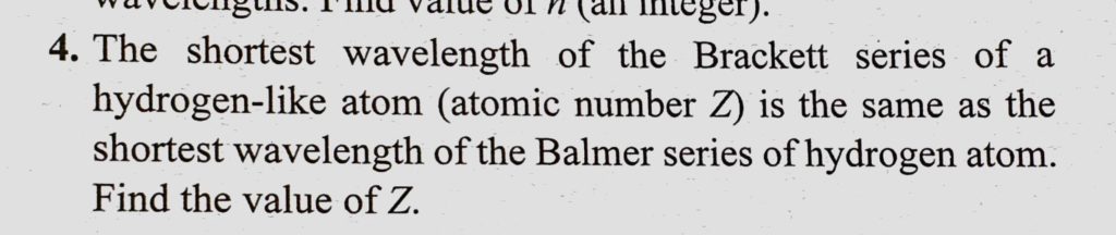 The shortest wavelength of the Brackett series of a hydrogen-like atom (atomic number Z) is the same as the shortest wavelength of the Balmer series of hydrogen atom. Find the value of Z. The shortest wavelength of the Brackett series of a hydrogen-like atom (atomic number Z) is the same as the shortest wavelength of the Balmer series of hydrogen atom. Find the value of Z. October 16, 2020 Category: Uncategorised (JEE Advanced Physics by BM Sharma + GMP Solutions) , Facebook Messenger WhatsApp Share this:TwitterFacebook Related
