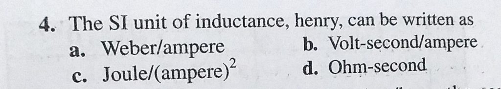 The SI unit of inductance, henry, can be written as a. Weber/ampere b. Volt-second/ampere c. Joule/(ampere)^2 can be written as a. Weber/ampere b. Volt-second/ampere c. Joule/(ampere)^2 henry The SI unit of inductance September 16, 2020 Category: Uncategorised (JEE Advanced Physics by BM Sharma + GMP Solutions) , Facebook Messenger WhatsApp Share this:TwitterFacebook Related