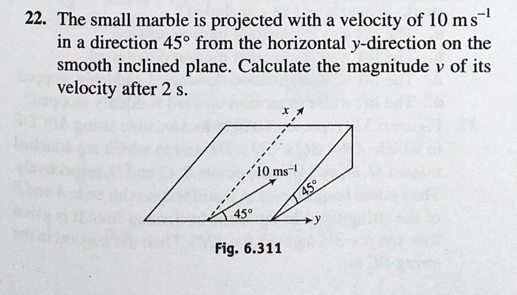 The small marble is projected with a velocity of 10 m/s in a direction 45 from the horizontal y direction on the smooth inclined plane. Calculate the magnitude v of its velocity after 2 s. The small marble is projected with a velocity of 10 m/s in a direction 45 from the horizontal y direction on the smooth inclined plane. Calculate the magnitude v of its velocity after 2 s. September 29, 2020 Category: Uncategorised (JEE Advanced Physics by BM Sharma + GMP Solutions) , Facebook Messenger WhatsApp Share this:TwitterFacebook Related