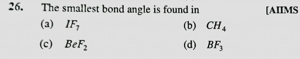 The smallest bond angle is found in (a) IF7 (b) CH4 (c) BeF2 (d) BF3 The smallest bond angle is found in (a) IF7 (b) CH4 (c) BeF2 (d) BF3 December 6, 2020 Category: Uncategorised (JEE Advanced Physics by BM Sharma + GMP Solutions) , Facebook Messenger WhatsApp Share this:TwitterFacebook Related