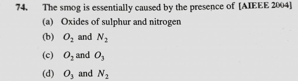 The smog is essentially caused by the presence of (a) Oxides of sulphur and nitrogen (b) O2 and N2 The smog is essentially caused by the presence of (a) Oxides of sulphur and nitrogen (b) O2 and N2 November 23, 2020 Category: Uncategorised (JEE Advanced Physics by BM Sharma + GMP Solutions) , Facebook Messenger WhatsApp Share this:TwitterFacebook Related