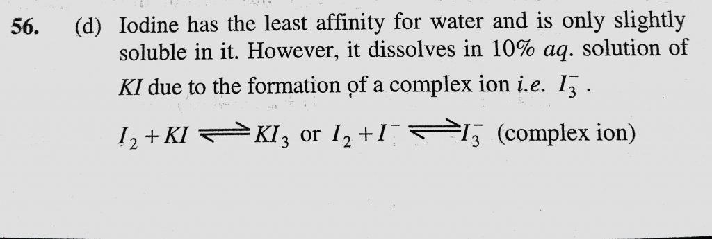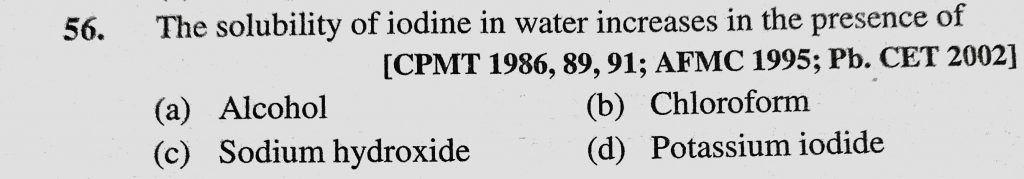 The solubility of iodine in water increases in the presence of (a) Alcohol (b) Chloroform (c) Sodium hydroxide (d) Potassium iodide The solubility of iodine in water increases in the presence of (a) Alcohol (b) Chloroform (c) Sodium hydroxide (d) Potassium iodide November 24, 2020 Category: Uncategorised (JEE Advanced Physics by BM Sharma + GMP Solutions) , Facebook Messenger WhatsApp Share this:TwitterFacebook Related