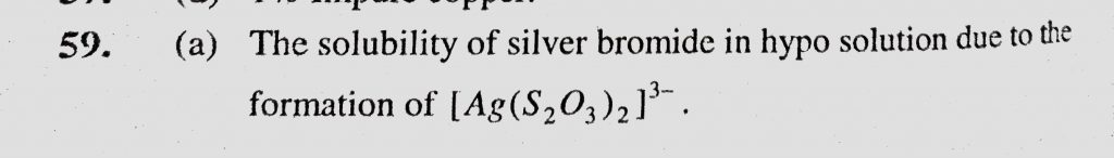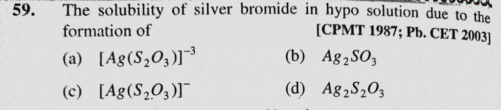 The solubility of silver bromide in hypo solution due to the formation of (a) (Ag(s2O3))-3 (b) Ag2SO3 (c) (Ag(S2O3))- The solubility of silver bromide in hypo solution due to the formation of (a) (Ag(s2O3))-3 (b) Ag2SO3 (c) (Ag(S2O3))- December 1, 2020 Category: Uncategorised (JEE Advanced Physics by BM Sharma + GMP Solutions) , Facebook Messenger WhatsApp Share this:TwitterFacebook Related
