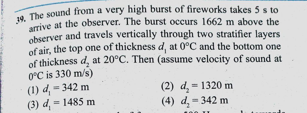 The sound from a very high burst of fireworks takes 5 s to arrive at the observer. The burst occur 1662 m above the observer and travels vertically through two stratifier layers The sound from a very high burst of fireworks takes 5 s to arrive at the observer. The burst occur 1662 m above the observer and travels vertically through two stratifier layers November 7, 2020 Category: Uncategorised (JEE Advanced Physics by BM Sharma + GMP Solutions) , Facebook Messenger WhatsApp Share this:TwitterFacebook Related