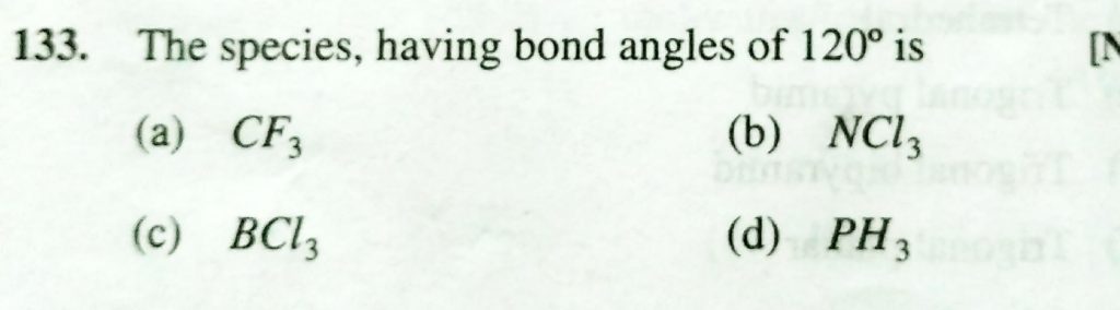 The species , having bond angles of 120 degree is (a) CF3 (b) NCL3 (c) BCL3 (d) PH3 having bond angles of 120 degree is (a) CF3 (b) NCL3 (c) BCL3 (d) PH3 The species December 7, 2020 Category: Uncategorised (JEE Advanced Physics by BM Sharma + GMP Solutions) , Facebook Messenger WhatsApp Share this:TwitterFacebook Related