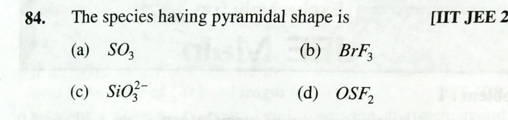 The species having pyramidal shape is (a) SO3 (b) BrF3 (c) SiO3^2- (d) OSF2 The species having pyramidal shape is (a) SO3 (b) BrF3 (c) SiO3^2- (d) OSF2 December 15, 2020 Category: Uncategorised (JEE Advanced Physics by BM Sharma + GMP Solutions) , Facebook Messenger WhatsApp Share this:TwitterFacebook Related