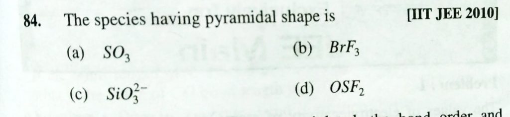 The species having pyramidal shape is (a) SO3 (b) BrF3 (c) SiO3^2- (d) OSF2 The species having pyramidal shape is (a) SO3 (b) BrF3 (c) SiO3^2- (d) OSF2 December 10, 2020 Category: Uncategorised (JEE Advanced Physics by BM Sharma + GMP Solutions) , Facebook Messenger WhatsApp Share this:TwitterFacebook Related