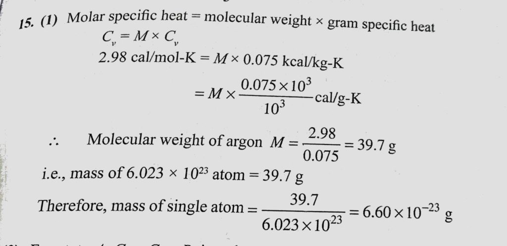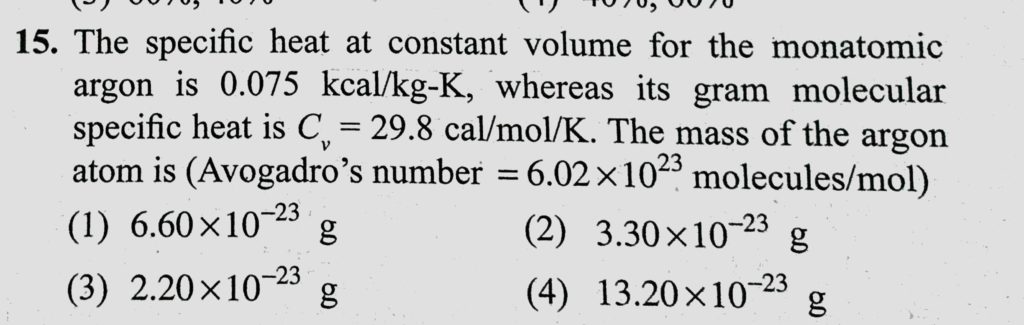 The specific heat at constant volume for the monatomic argon is 0.075 kcal/kg-K, whereas its gram molecular specific heat is Cv = 29.8 cal/mol/K. The mass of the argon atom is The specific heat at constant volume for the monatomic argon is 0.075 kcal/kg-K whereas its gram molecular specific heat is Cv = 29.8 cal/mol/K. The mass of the argon atom is October 28, 2020 Category: Uncategorised (JEE Advanced Physics by BM Sharma + GMP Solutions) , Facebook Messenger WhatsApp Share this:TwitterFacebook Related