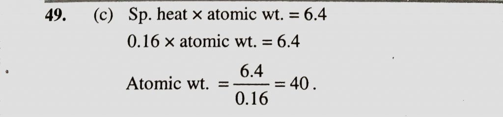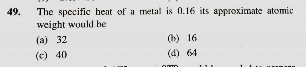 The specific heat of a metal is 0.16 its approximate atomic weight would be (a) 32 (b) 16 (c) 40 (d) 64 The specific heat of a metal is 0.16 its approximate atomic weight would be (a) 32 (b) 16 (c) 40 (d) 64 November 22, 2020 Category: Uncategorised (JEE Advanced Physics by BM Sharma + GMP Solutions) , Facebook Messenger WhatsApp Share this:TwitterFacebook Related
