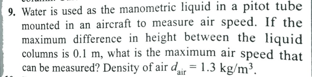 Water is used as the manometric liquid in a pitot tube mounted in an aircraft to measure air speed. If the maximum difference in height between the liquid columns is 0.1 m, what is the maximum air speed that can be measured? Density of air dair = 1.3 kg/m^3