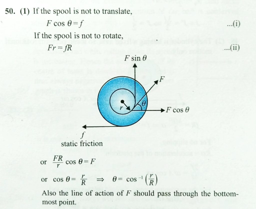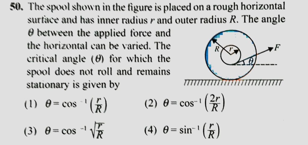 The spool shown in the figure is placed on a rough horizontal surface and has inner radius r and outer radius R. The angle θ between the applied force and the horizontal can be varied. The critical angle θ for which the spool does not roll and remains stationary is given by
