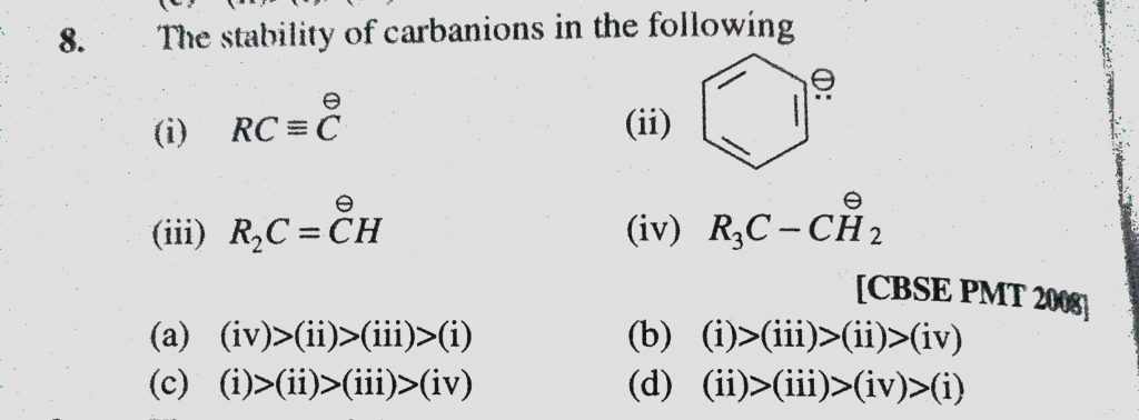The stability of carbanions in the following (i) RC≡C..− , (ii) (iii) R2C=C..−H , (iv) R3C−C..−H2 is in the order (ii) (iii) R2C=C..−H (iv) R3C−C..−H2 is in the order The stability of carbanions in the following (i) RC≡C..− December 8, 2020 Category: Uncategorised (JEE Advanced Physics by BM Sharma + GMP Solutions) , Facebook Messenger WhatsApp Share this:TwitterFacebook Related