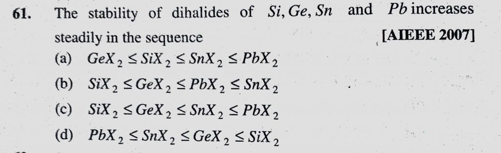 The stability of dihalides of Si, Ge, Sn and Pb increases steadily in the sequence (a) GeX2 < SiX2 < SnX2 < PbX2 Ge Sn and Pb increases steadily in the sequence (a) GeX2 < SiX2 < SnX2 < PbX2 The stability of dihalides of Si November 18, 2020 Category: Uncategorised (JEE Advanced Physics by BM Sharma + GMP Solutions) , Facebook Messenger WhatsApp Share this:TwitterFacebook Related