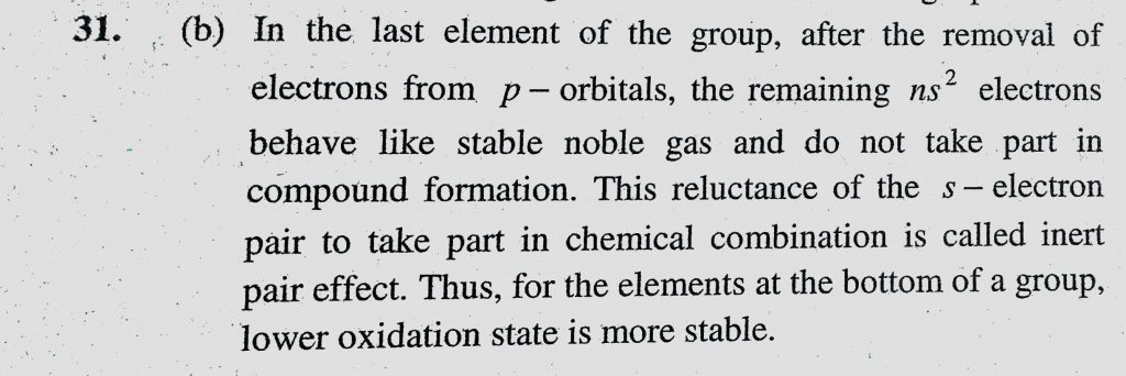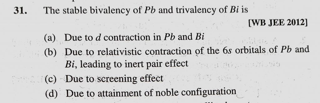 The stable bivalency of Pb and trivalency of Bi is (a) Due to d contraction in Pb and Bi is (b) Due to relativistic contraction of the 6 s orbitals of Pb and Bi, leading to inert pair effect leading to inert pair effect The stable bivalency of Pb and trivalency of Bi is (a) Due to d contraction in Pb and Bi is (b) Due to relativistic contraction of the 6 s orbitals of Pb and Bi November 10, 2020 Category: Uncategorised (JEE Advanced Physics by BM Sharma + GMP Solutions) , Facebook Messenger WhatsApp Share this:TwitterFacebook Related