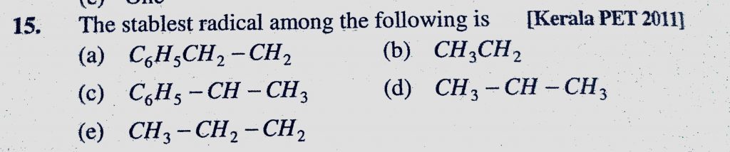 The stable radical among the following is (a) C6H5CH2-CH2 (b) CH3CH2 (c) C6H5-CH-CH3 (d) CH3-CH-CH3 The stable radical among the following is (a) C6H5CH2-CH2 (b) CH3CH2 (c) C6H5-CH-CH3 (d) CH3-CH-CH3 December 11, 2020 Category: Uncategorised (JEE Advanced Physics by BM Sharma + GMP Solutions) , Facebook Messenger WhatsApp Share this:TwitterFacebook Related