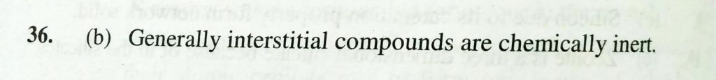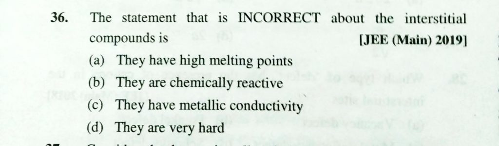 The statement that is INCORRECT about the interstitial compounds is (a) They have high melting points (b) THey are chemically reactive (c) They have metallic conductivity (d) They are very hard The statement that is INCORRECT about the interstitial compounds is (a) They have high melting points (b) THey are chemically reactive (c) They have metallic conductivity (d) They are very hard February 10, 2021 Category: Uncategorised (JEE Advanced Physics by BM Sharma + GMP Solutions) , Facebook Messenger WhatsApp Share this:TwitterFacebook Related
