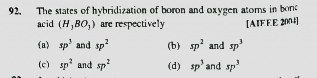 The states of hybridization of boron and oxygen atoms in boric acid ( H3BO3 ) are respectively The states of hybridization of boron and oxygen atoms in boric acid ( H3BO3 ) are respectively December 6, 2020 Category: Uncategorised (JEE Advanced Physics by BM Sharma + GMP Solutions) , Facebook Messenger WhatsApp Share this:TwitterFacebook Related