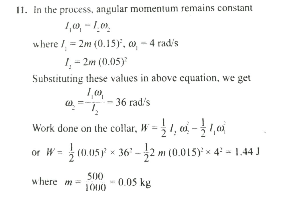 The steel balls A and B have a mass of 500 g each and are rotating about the vertical axis with an angular velocity of 4 rad/s at a distance of 15 CM from the axis. Collar C is now forced down until the balls are at a distance 5 CM from the axis. How Much work must be done move the collar down?