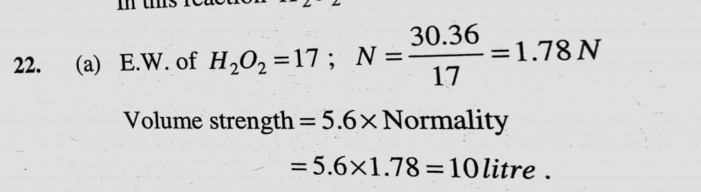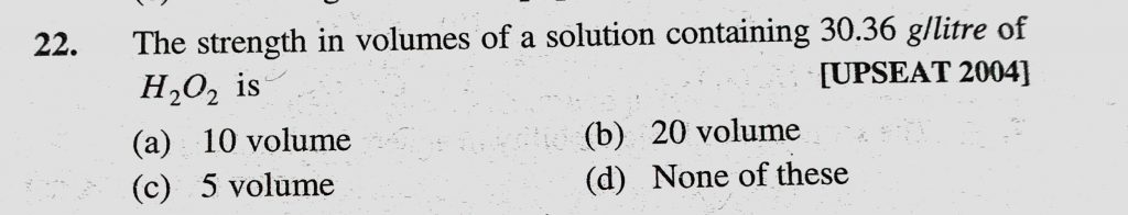 The strength in volumes of a solution containing 30.36 g/litre of H2O2 is (a) 10 volume (b) 20 volume (c) 5 volume (d) None of these The strength in volumes of a solution containing 30.36 g/litre of H2O2 is (a) 10 volume (b) 20 volume (c) 5 volume (d) None of these November 13, 2020 Category: Uncategorised (JEE Advanced Physics by BM Sharma + GMP Solutions) , Facebook Messenger WhatsApp Share this:TwitterFacebook Related
