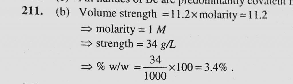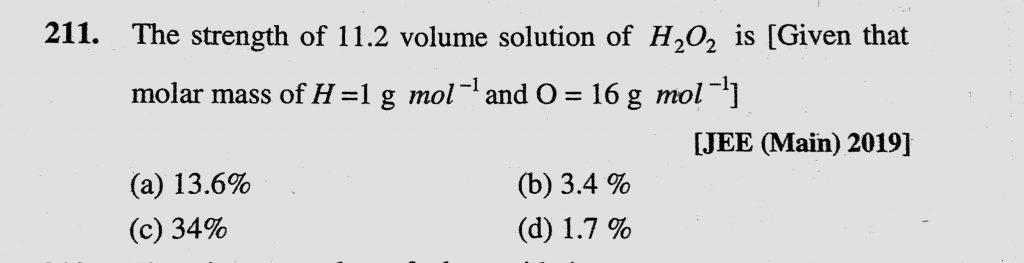 The strength of 11.2 volume solution of H2O2 is (Given that molar mass of H = 1 g/mol and O = 16 g/mol) (a) 13.6% (b) 3.4% (c) 34% The strength of 11.2 volume solution of H2O2 is (Given that molar mass of H = 1 g/mol and O = 16 g/mol) (a) 13.6% (b) 3.4% (c) 34% November 28, 2020 Category: Uncategorised (JEE Advanced Physics by BM Sharma + GMP Solutions) , Facebook Messenger WhatsApp Share this:TwitterFacebook Related