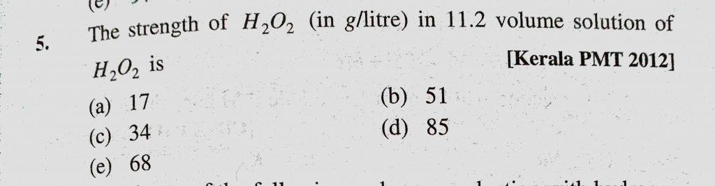 The strength of H2O2 (in g/litre) in 11.2 volume solution of H2O2 is (a) 17 (b) 51 (c) 34 (d) 85 (e) 68 The strength of H2O2 (in g/litre) in 11.2 volume solution of H2O2 is (a) 17 (b) 51 (c) 34 (d) 85 (e) 68 November 13, 2020 Category: Uncategorised (JEE Advanced Physics by BM Sharma + GMP Solutions) , Facebook Messenger WhatsApp Share this:TwitterFacebook Related