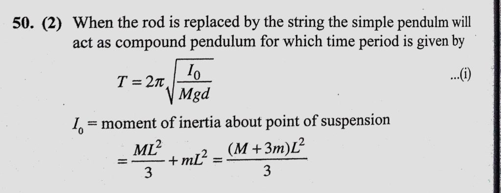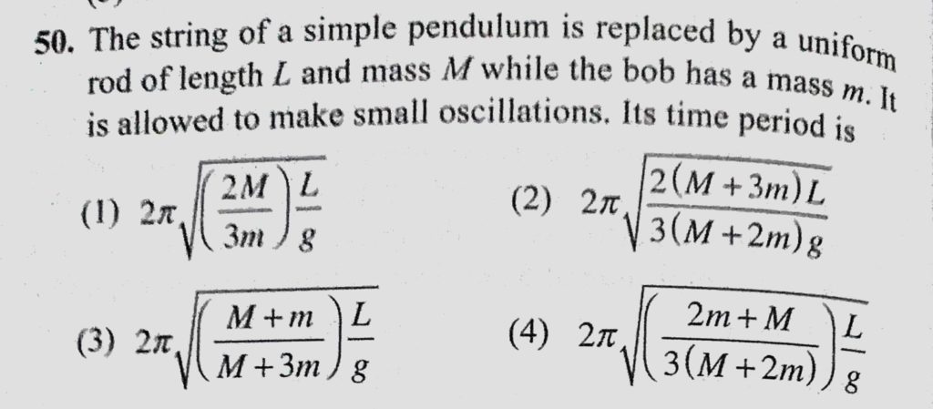 The string of a simple pendulum is replaced by a uniform rod of length L and mass M while the bob has a mass m. It is allowed to make small oscillations. Its time period is The string of a simple pendulum is replaced by a uniform rod of length L and mass M while the bob has a mass m. It is allowed to make small oscillations. Its time period is October 31, 2020 Category: Uncategorised (JEE Advanced Physics by BM Sharma + GMP Solutions) , Facebook Messenger WhatsApp Share this:TwitterFacebook Related