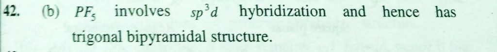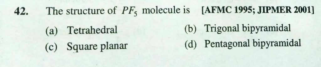 The structure of PF5 molecule is (a) Tetrahedral (b) trigonal bipyramidal (c) square planar (d) pentagonal bipyramidal The structure of PF5 molecule is (a) Tetrahedral (b) trigonal bipyramidal (c) square planar (d) pentagonal bipyramidal December 6, 2020 Category: Uncategorised (JEE Advanced Physics by BM Sharma + GMP Solutions) , Facebook Messenger WhatsApp Share this:TwitterFacebook Related