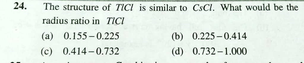 The structure of TICI is similar to CsCl. what would be the radius ratio in TICI (a) 0.155 – 0.225 (b) 0.225 – 0.414 (c) 0.414 – 0.732 (d) 0.732 – 1.000 The structure of TICI is similar to CsCl. what would be the radius ratio in TICI (a) 0.155 - 0.225 (b) 0.225 - 0.414 (c) 0.414 - 0.732 (d) 0.732 - 1.000 February 8, 2021 Category: Uncategorised (JEE Advanced Physics by BM Sharma + GMP Solutions) , Facebook Messenger WhatsApp Share this:TwitterFacebook Related