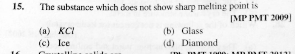 The substance which does not show sharp melting point is (a) KCL (b) Glass (c) Ice (d) Diamond The substance which does not show sharp melting point is (a) KCL (b) Glass (c) Ice (d) Diamond December 16, 2020 Category: Uncategorised (JEE Advanced Physics by BM Sharma + GMP Solutions) , Facebook Messenger WhatsApp Share this:TwitterFacebook Related