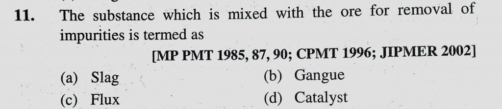 The substance which is mixed with the ore for removal of impurities is termed as (a) Slag (b) Gangue (c) Flux (d) Catalyst The substance which is mixed with the ore for removal of impurities is termed as (a) Slag (b) Gangue (c) Flux (d) Catalyst November 11, 2020 Category: Uncategorised (JEE Advanced Physics by BM Sharma + GMP Solutions) , Facebook Messenger WhatsApp Share this:TwitterFacebook Related