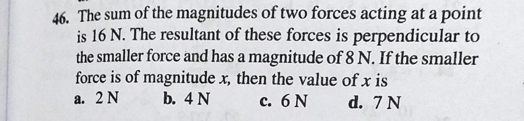 The sum of the magnitudes of two forces acting at a point is 16 N. The resultant of these forces is perpendicular to the smaller force and has a magnitude of 8 N. If the smaller force is of The sum of the magnitudes of two forces acting at a point is 16 N. The resultant of these forces is perpendicular to the smaller force and has a magnitude of 8 N. If the smaller force is of September 17, 2020 Category: Uncategorised (JEE Advanced Physics by BM Sharma + GMP Solutions) , Facebook Messenger WhatsApp Share this:TwitterFacebook Related