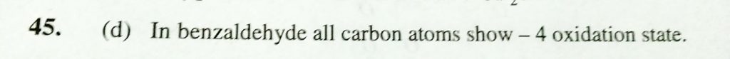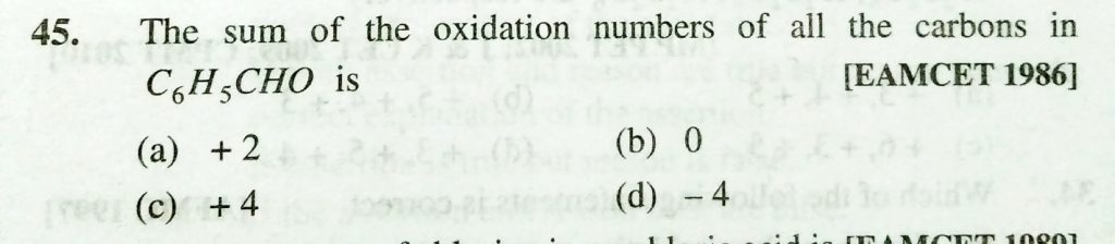 The sum of the oxidation numbers of all the carbons in C6H5CHO is (a) +2 (b) 0 (c) +4 (d) – 4 The sum of the oxidation numbers of all the carbons in C6H5CHO is (a) +2 (b) 0 (c) +4 (d) - 4 November 24, 2020 Category: Uncategorised (JEE Advanced Physics by BM Sharma + GMP Solutions) , Facebook Messenger WhatsApp Share this:TwitterFacebook Related