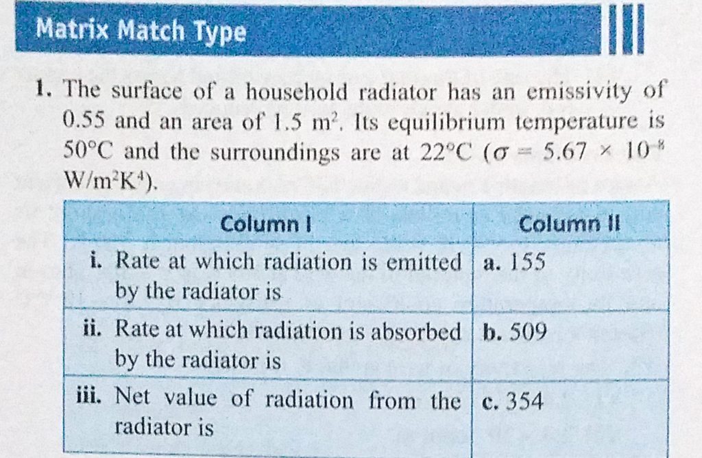 The surface of a household radiator has an emissivity of 0.55 and an area of 1.5 m^2. Its equilibrium temperature is 50 C and the surroundings are at 22 C The surface of a household radiator has an emissivity of 0.55 and an area of 1.5 m^2. Its equilibrium temperature is 50 C and the surroundings are at 22 C October 25, 2020 Category: Uncategorised (JEE Advanced Physics by BM Sharma + GMP Solutions) , Facebook Messenger WhatsApp Share this:TwitterFacebook Related