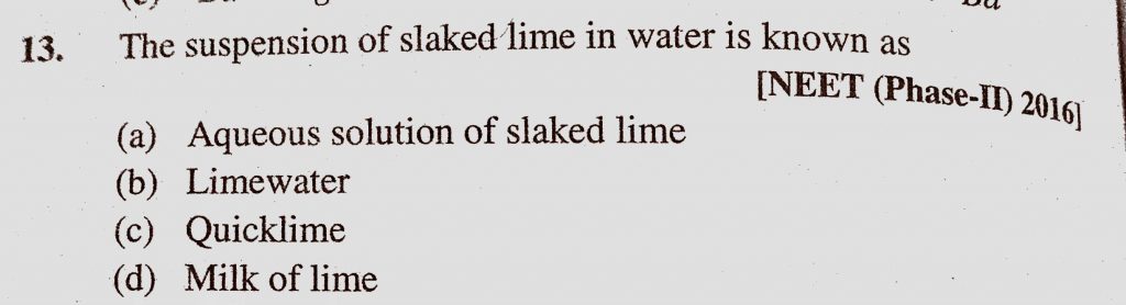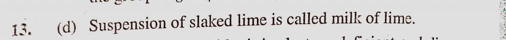 The suspension of slaked lime in water is known as (a) Aqueous solution of slaked lime (b) Limewater (c) Quicklime (d) Milk of lime The suspension of slaked lime in water is known as (a) Aqueous solution of slaked lime (b) Limewater (c) Quicklime (d) Milk of lime November 15, 2020 Category: Uncategorised (JEE Advanced Physics by BM Sharma + GMP Solutions) , Facebook Messenger WhatsApp Share this:TwitterFacebook Related